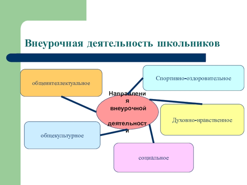 Внеурочная деятельность школьниковНаправления внеурочной деятельностиобщеинтеллектуальноеобщекультурноесоциальноеДуховно-нравственноеСпортивно-оздоровительное