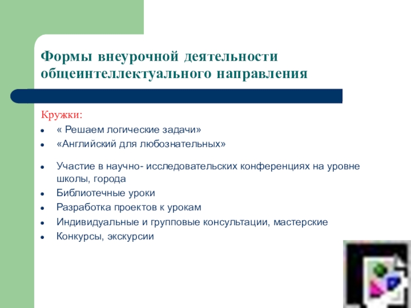 Формы внеурочной деятельности общеинтеллектуального направленияКружки:« Решаем логические задачи»«Английский для любознательных»Участие в научно- исследовательских конференциях на уровне