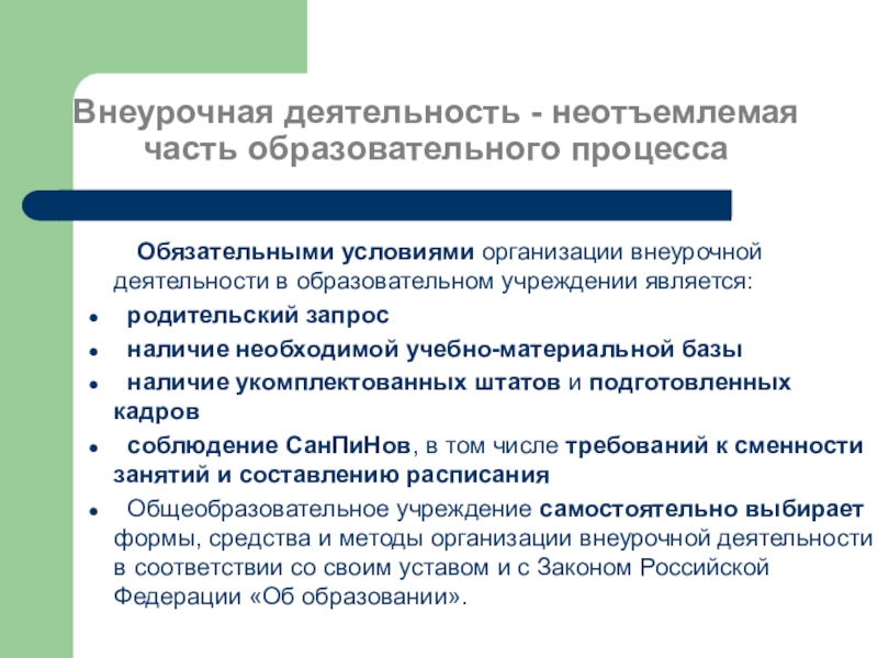 Внеурочная деятельность - неотъемлемая часть образовательного процесса Обязательными условиями организации внеурочной деятельности в образовательном учреждении является: родительский запрос наличие необходимой учебно-материальной базы наличие укомплектованных штатов и подготовленных
