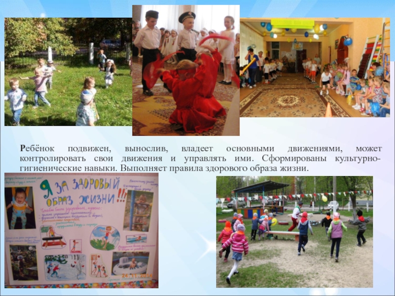 Слайд 8Ребёнок подвижен, вынослив, владеет основными движениями, может контролировать свои движения и