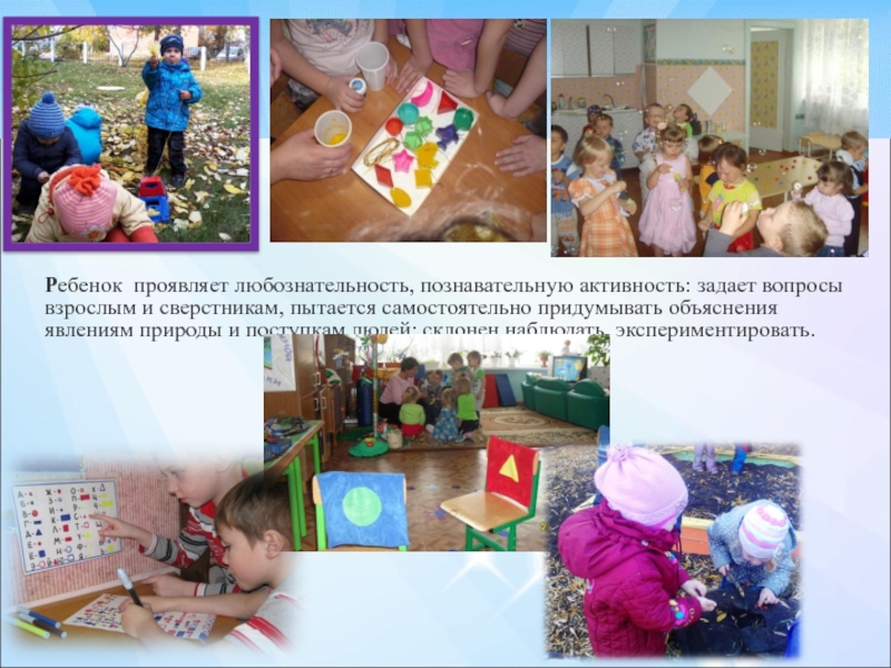 Слайд 10Ребенок проявляет любознательность, познавательную активность: задает вопросы взрослым и сверстникам, пытается