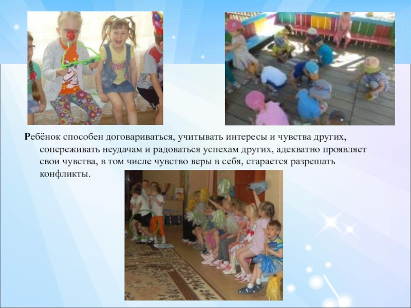 Слайд 5Ребёнок способен договариваться, учитывать интересы и чувства других, сопереживать неудачам и