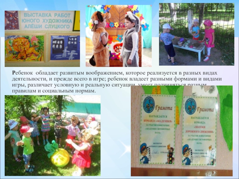 Слайд 6Ребенок обладает развитым воображением, которое реализуется в разных видах деятельности, и