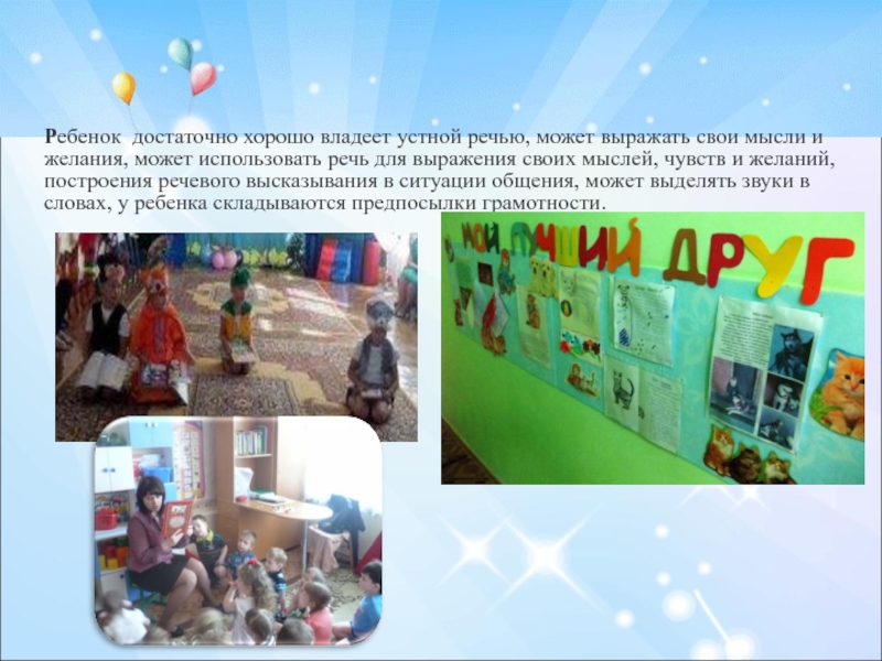 Слайд 7Ребенок достаточно хорошо владеет устной речью, может выражать свои мысли и