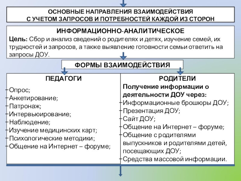 Сбор и анализ сведений о родителях (законных представителей) и детях, изучение семей, их трудностей и запросов; выявление готовности семьи ответить на запросы дошкольного учреждения.