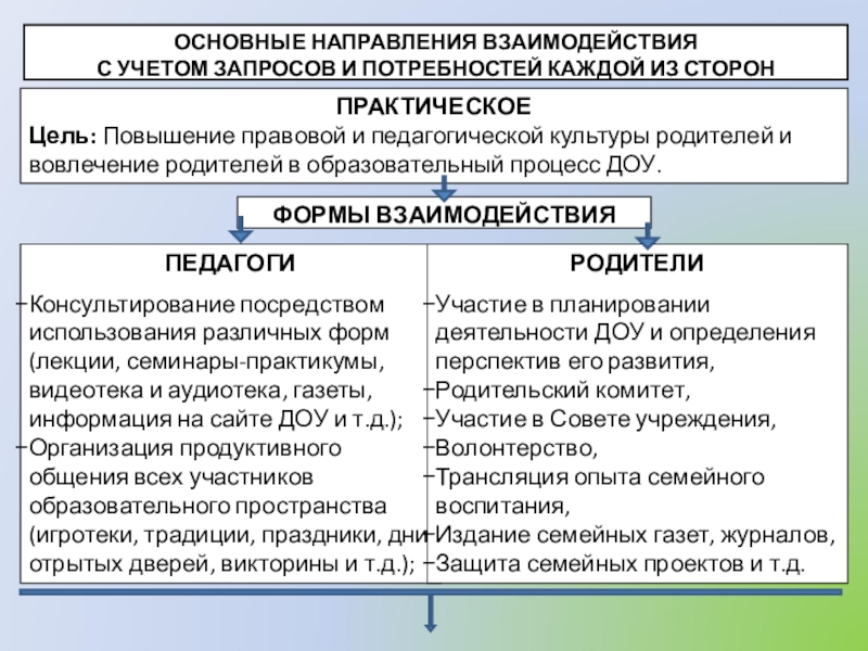 Выстраивание эффективного взаимодействия с родителями на основе нормативно- правовых документов разного уровня;