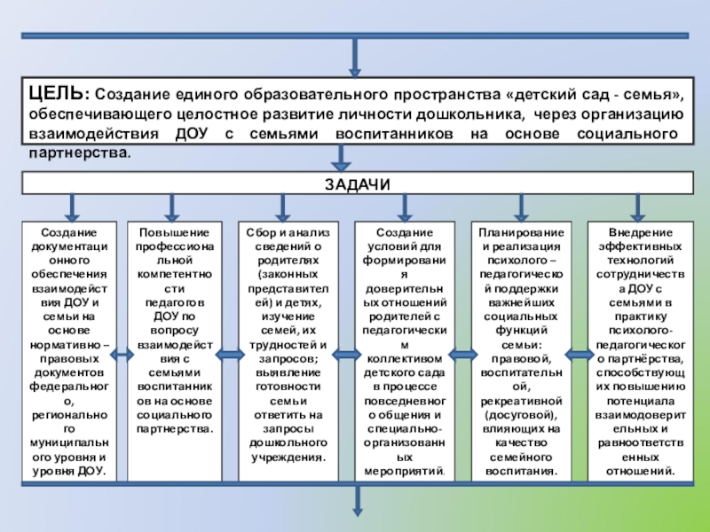Внедрение эффективных технологий сотрудничества ДОУ с семьями в практику психолого-педагогического партнёрства, способствующих повышению потенциала взаимодоверительных и равноответственных отношений.