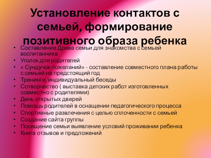 Слайд 3 Установление контактов с семьей, формирование позитивного образа ребенка
