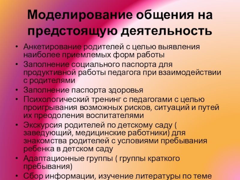 Моделирование общения на предстоящую деятельностьАнкетирование родителей с целью выявления наиболее приемлемых форм работыЗаполнение социального паспорта для продуктивной работы педагога при взаимодействии с родителямиЗаполнение паспорта здоровья Психологический тренинг с педагогами с целью проигрывания возможных рисков, ситуаций и