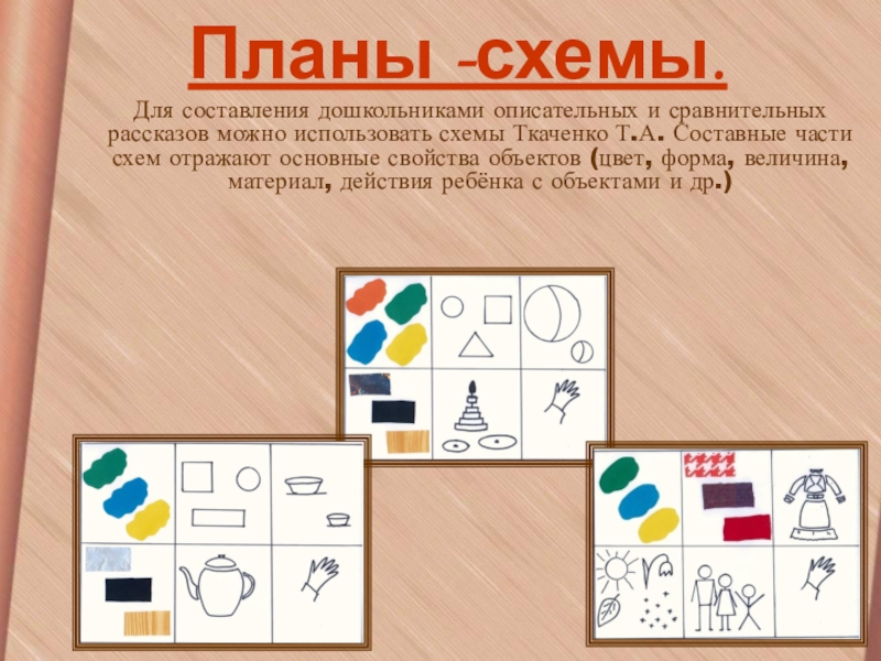 Ткаченко Т.А. Составные части схем отражают основные свойства объектов (цвет, форма, величина, материал, действия ребёнка с объектами и др.)