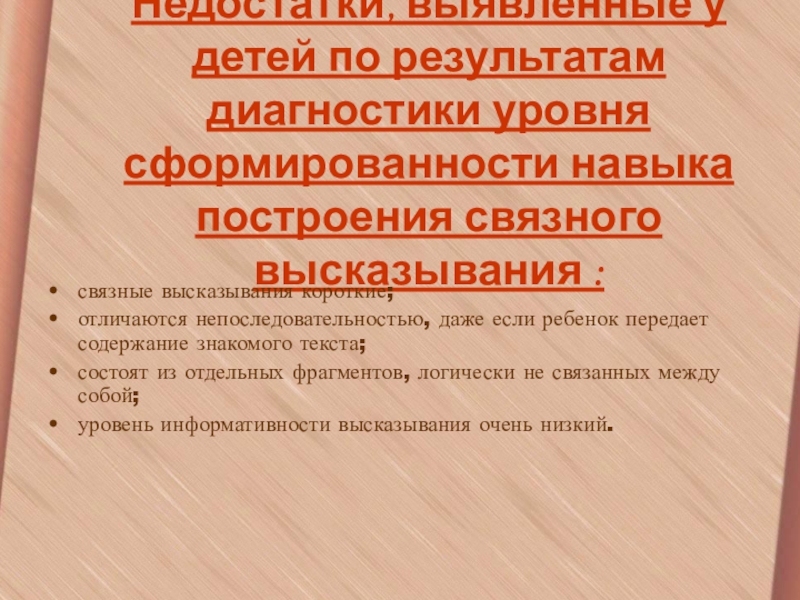 Слайд 3Недостатки, выявленные у детей по результатам диагностики уровня сформированности навыка построения
