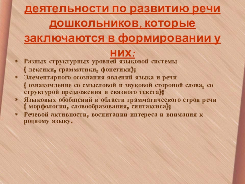 Слайд 5Основные задачи содержания деятельности по развитию речи дошкольников, которые заключаются в