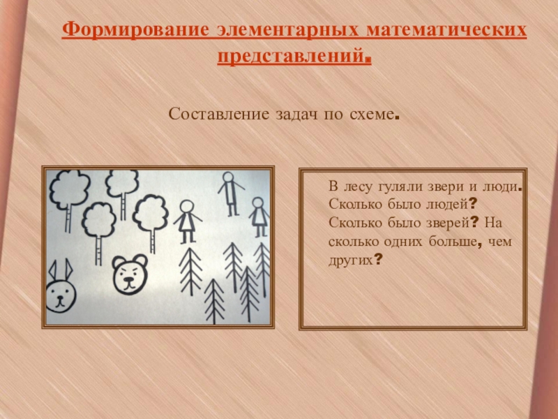 люди. Сколько было людей? Сколько было зверей? На сколько одних больше, чем других?