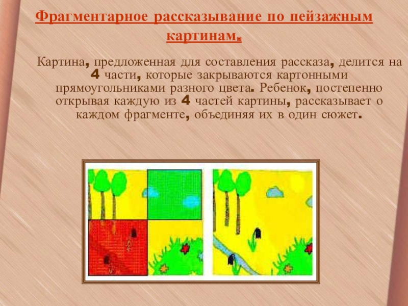 4 части, которые закрываются картонными прямоугольниками разного цвета. Ребенок, постепенно открывая каждую из 4 частей картины, рассказывает о каждом фрагменте, объединяя их в один сюжет.