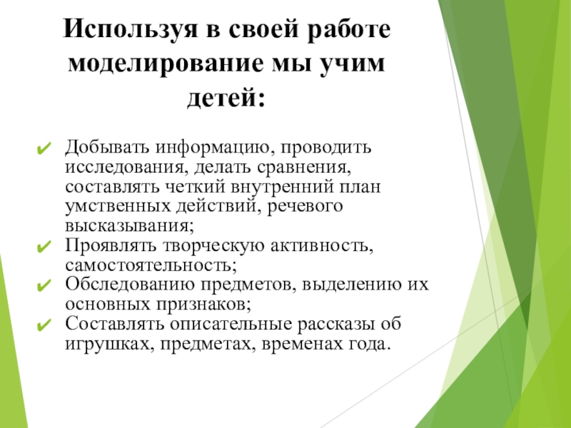 Слайд 28Используя в своей работе моделирование мы учим детей: