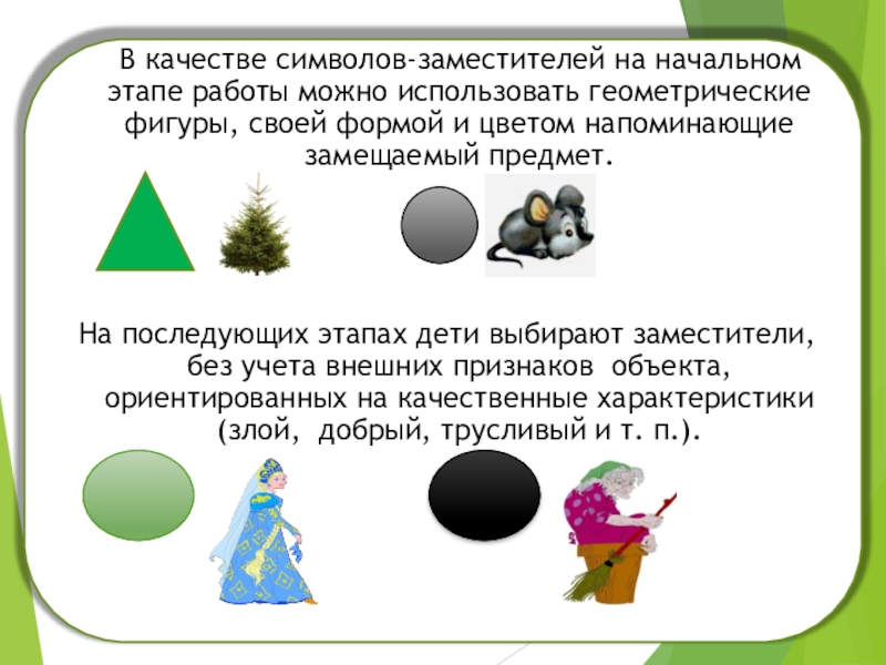В качестве символов-заместителей на начальном этапе работы можно использовать геометрические фигуры, своей формой и цветом напоминающие замещаемый предмет.