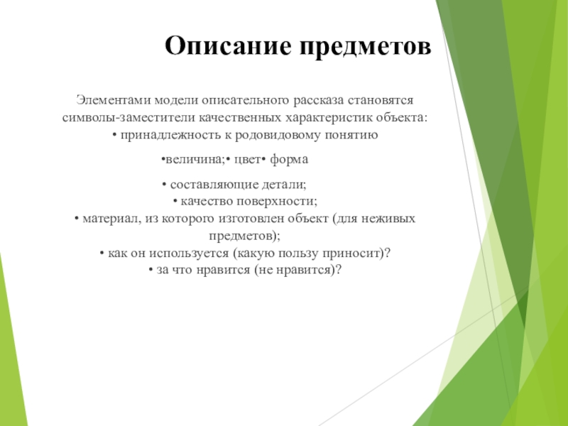 Элементами модели описательного рассказа становятся символы-заместители качественных характеристик объекта: