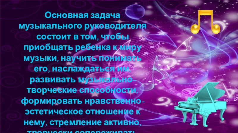 Слайд 3Основная задача музыкального руководителя состоит в том, чтобы приобщать ребенка к