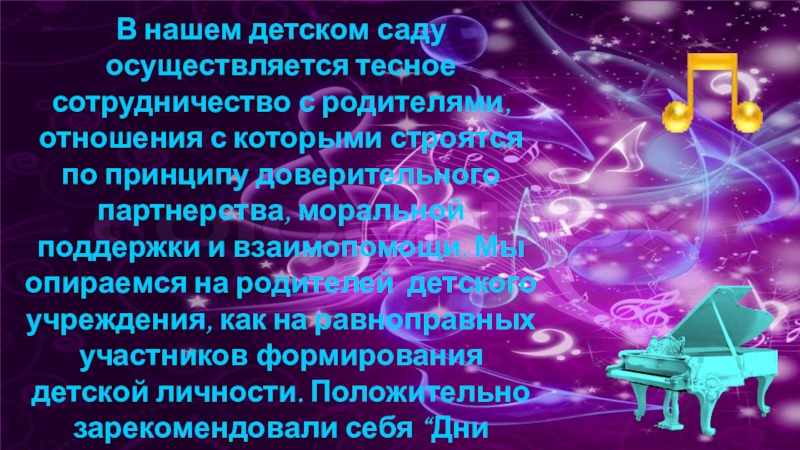 которыми строятся по принципу доверительного партнерства, моральной поддержки и взаимопомощи. Мы опираемся на родителей детского учреждения, как на равноправных участников формирования детской личности. Положительно зарекомендовали себя “Дни открытых дверей”, спортивные и фольклорные праздники с участием родителей.