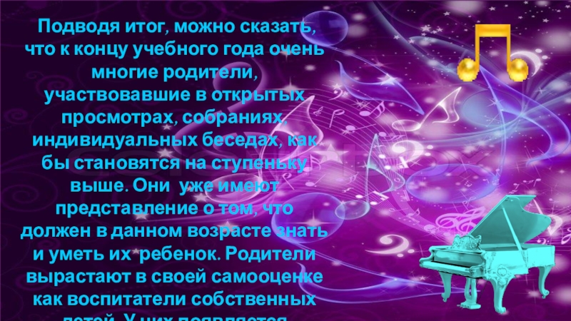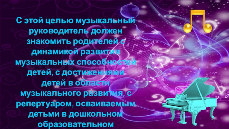 Слайд 9С этой целью музыкальный руководитель должен знакомить родителей с динамикой развития