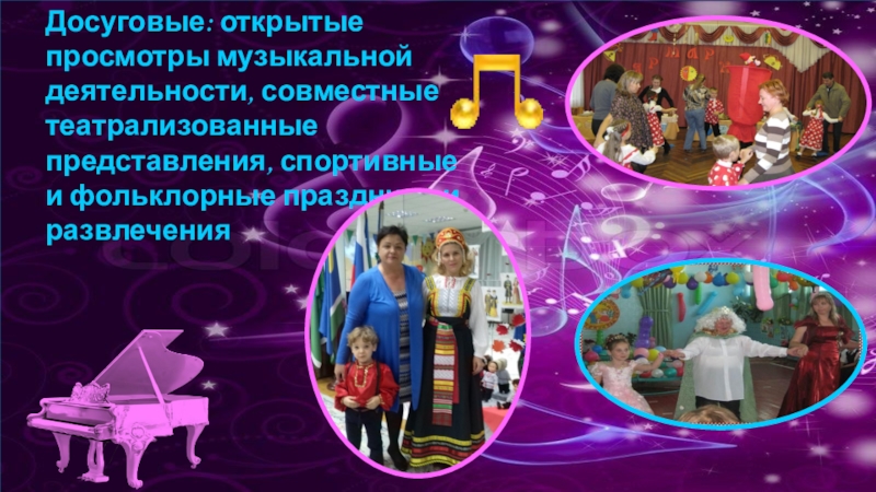 4. Досуговые: открытые просмотры музыкальной деятельности, совместные праздники и развлечения, дни здоровья, экскурсии, выставки, творческие конкурсы, совместные проекты .
