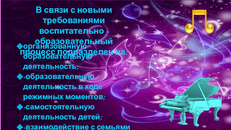 Слайд 7В связи с новыми требованиями воспитательно -образовательный процесс подразделен на: