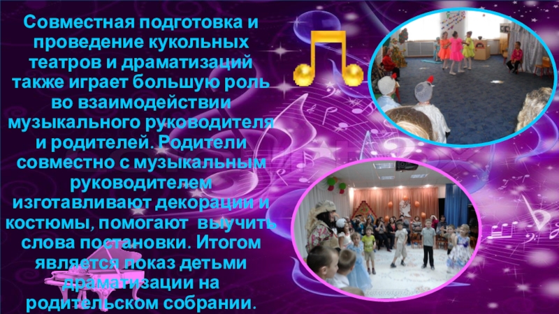 роль во взаимодействии музыкального руководителя и родителей. Родители совместно с музыкальным руководителем изготавливают декорации и костюмы, помогают выучить слова постановки. Итогом является показ детьми драматизации на родительском собрании.