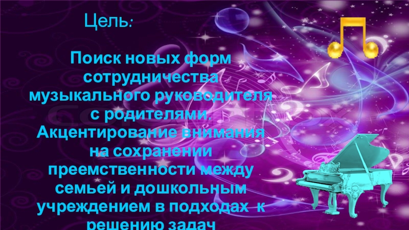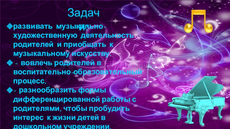 развивать музыкально-художественную деятельность родителей и приобщать к музыкальному искусству.
