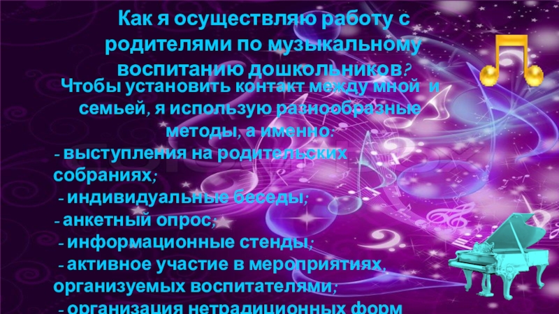 Слайд 12Как я осуществляю работу с родителями по музыкальному воспитанию дошкольников?