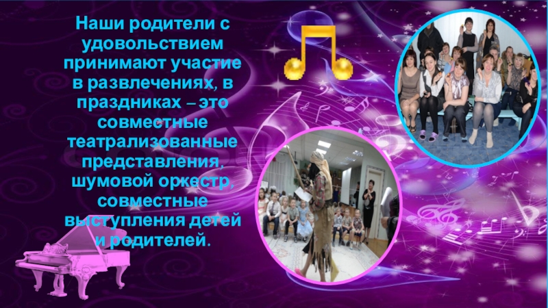 это совместные театрализованные представления, шумовой оркестр, совместные выступления детей и родителей.