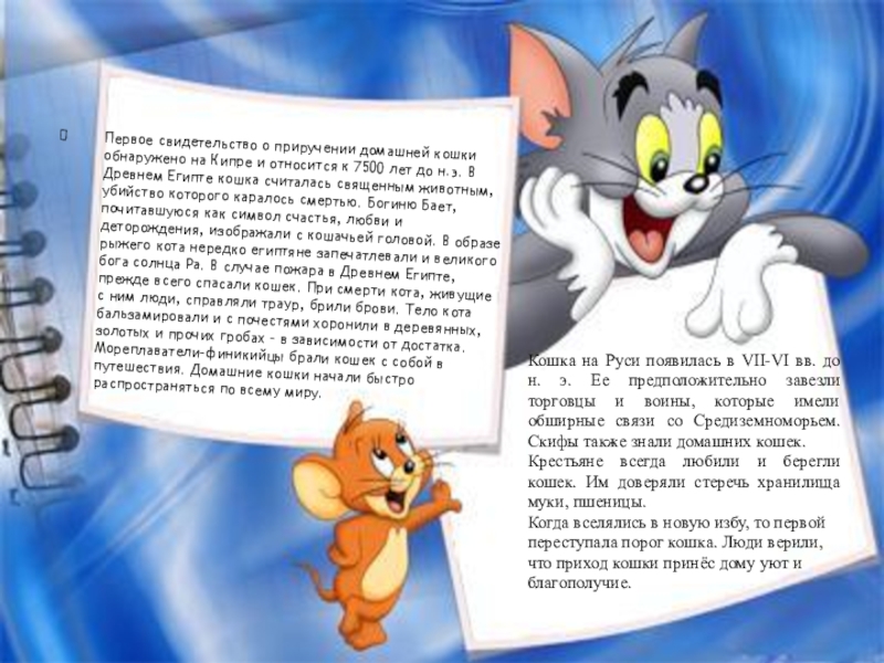 Кошка на Руси появилась в VII-VI вв. до н. э. Ее предположительно завезли торговцы и воины, которые имели обширные связи со Средиземноморьем. Скифы также знали домашних кошек.