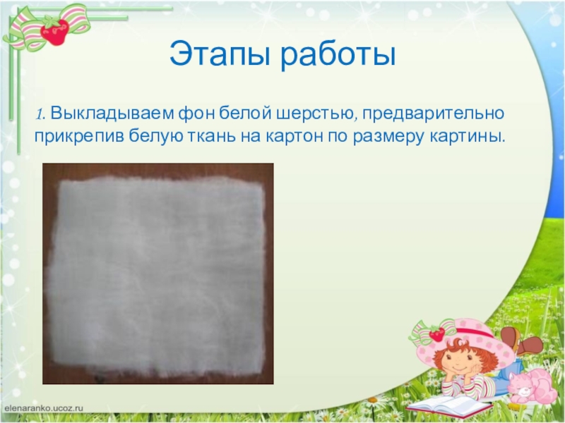 1. Выкладываем фон белой шерстью, предварительно прикрепив белую ткань на