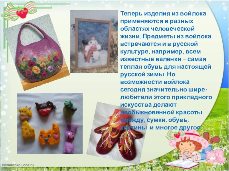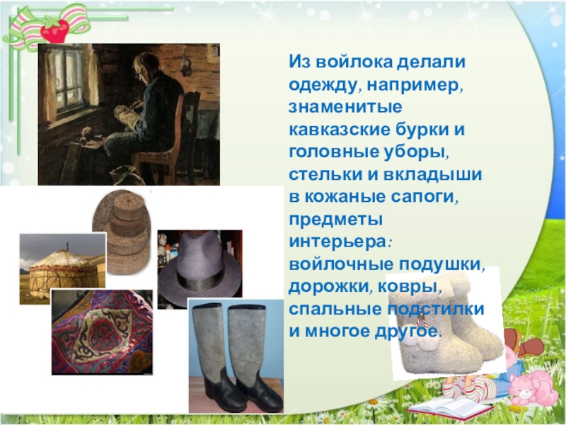 Слайд 9Теперь изделия из войлока применяются в разных областях человеческой жизни. Предметы