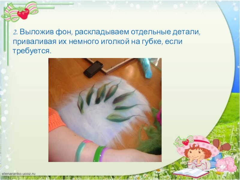 Слайд 152. Выложив фон, раскладываем отдельные детали, приваливая их немного иголкой на