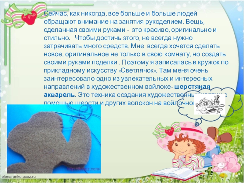 занятия рукоделием. Вещь, сделанная своими руками - это красиво, оригинально и стильно. Чтобы достичь этого, не всегда нужно затрачивать много средств. Мне всегда хочется сделать новое, оригинальное не только в свою комнату, но создать своими руками поделки . Поэтому я записалась в кружок по прикладному искусству «Светлячок». Там меня очень заинтересовало одно из увлекательных и интересных направлений в художественном войлоке- шерстяная акварель. Это техника создания художественных картин с помощью шерсти и других волокон на войлочной основе.