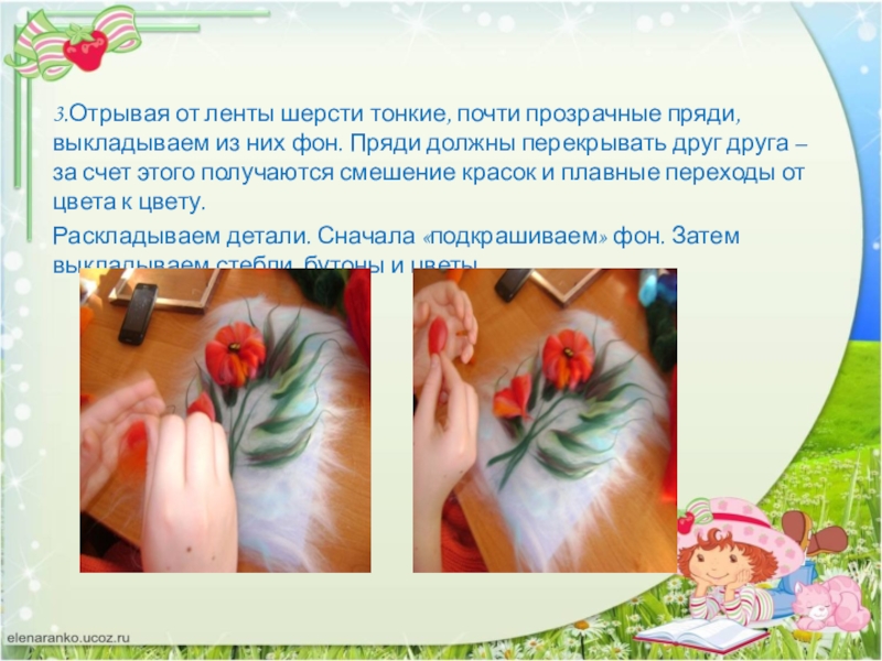 Слайд 163.Отрывая от ленты шерсти тонкие, почти прозрачные пряди, выкладываем из них