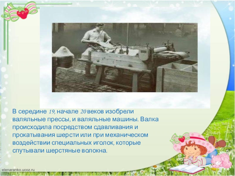 Слайд 8В середине 19, начале 20 веков изобрели валяльные прессы, и валяльные