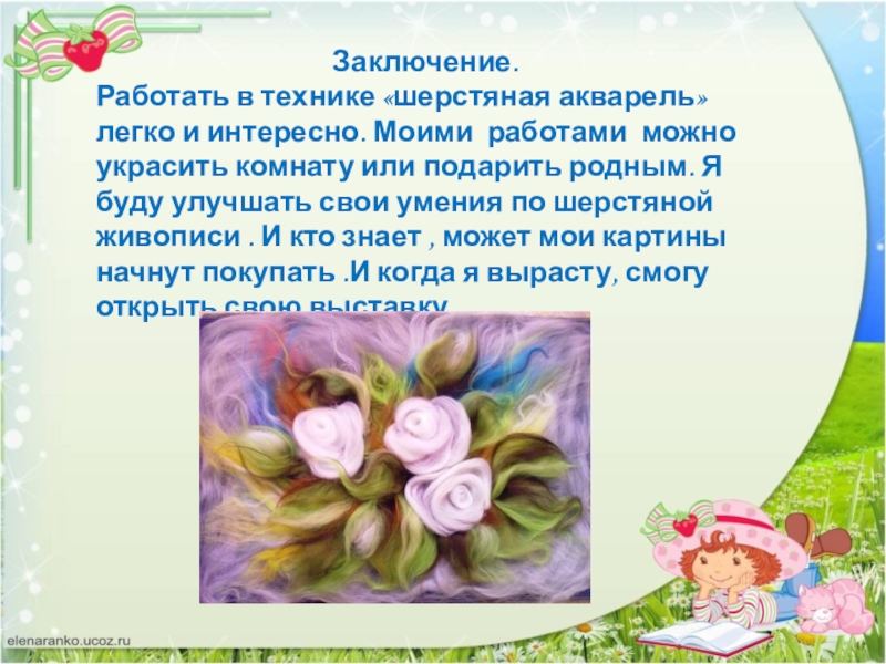 украсить комнату или подарить родным. Я буду улучшать свои умения по шерстяной живописи . И кто знает , может мои картины начнут покупать .И когда я вырасту, смогу открыть свою выставку.