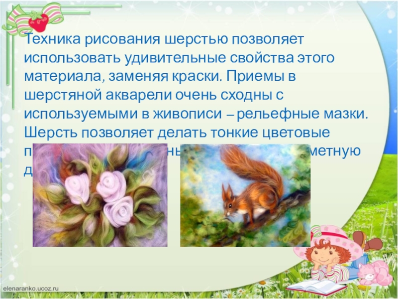 Слайд 12Техника рисования шерстью позволяет использовать удивительные свойства этого материала, заменяя краски.