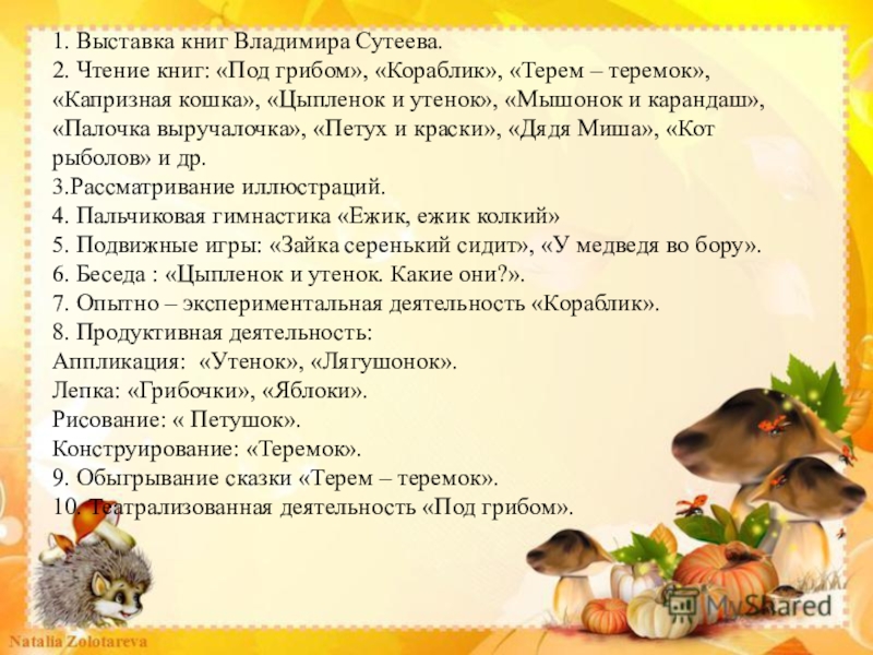 2. Чтение книг: «Под грибом», «Кораблик», «Терем