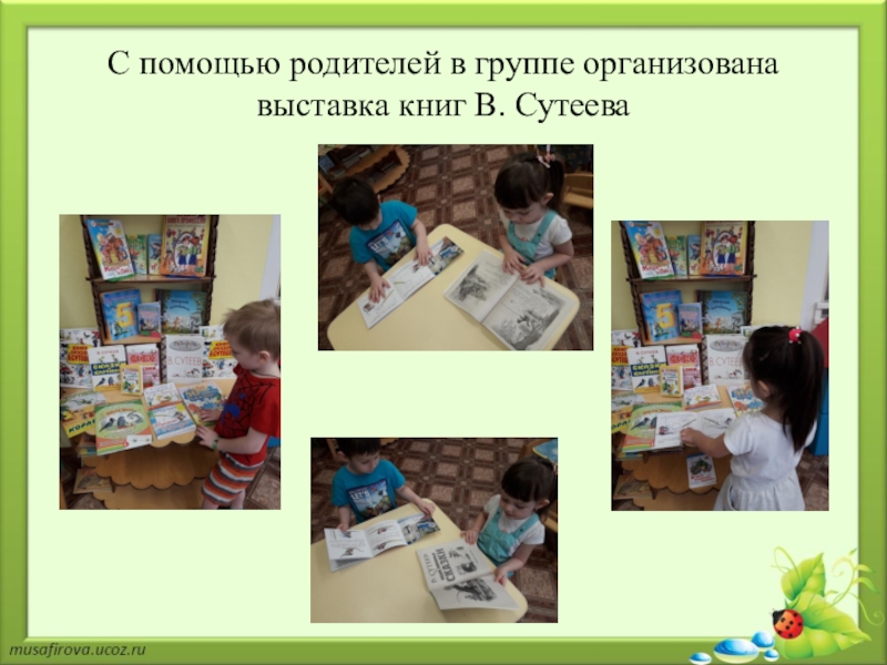 Слайд 6С помощью родителей в группе организована выставка книг В. Сутеева
