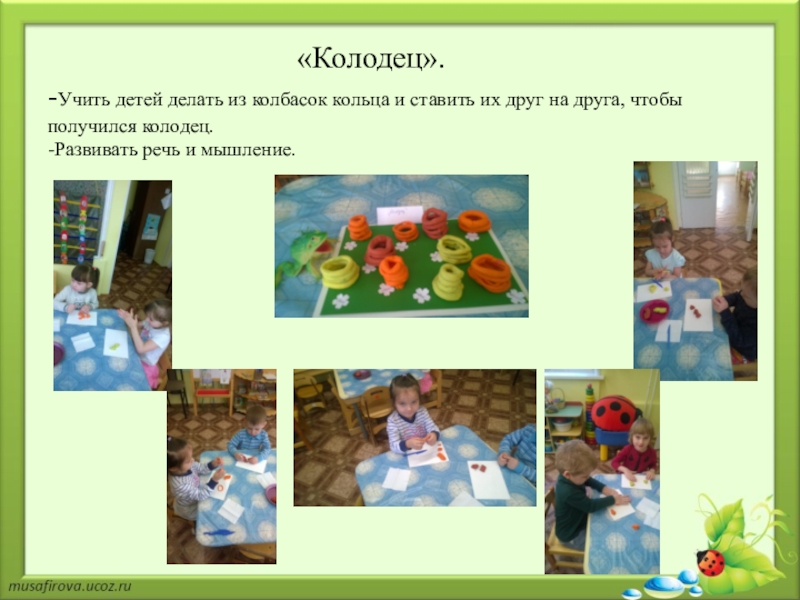 -Учить детей делать из колбасок кольца и ставить их друг на друга, чтобы получился колодец.