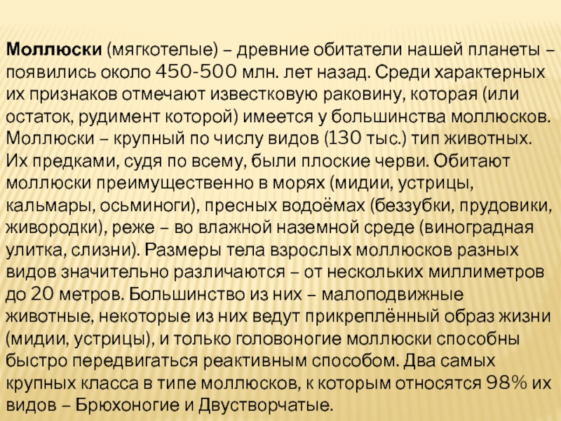 лет назад. Среди характерных их признаков отмечают известковую раковину, которая (или остаток, рудимент которой) имеется у большинства моллюсков. Моллюски – крупный по числу видов (130 тыс.) тип животных. Их предками, судя по всему, были плоские черви. Обитают моллюски преимущественно в морях (мидии, устрицы, кальмары, осьминоги), пресных водоёмах (беззубки, прудовики, живородки), реже – во влажной наземной среде (виноградная улитка, слизни). Размеры тела взрослых моллюсков разных видов значительно различаются – от нескольких миллиметров до 20 метров. Большинство из них – малоподвижные животные, некоторые из них ведут прикреплённый образ жизни (мидии, устрицы), и только головоногие моллюски способны быстро передвигаться реактивным способом. Два самых крупных класса в типе моллюсков, к которым относятся 98% их видов – Брюхоногие и Двустворчатые.