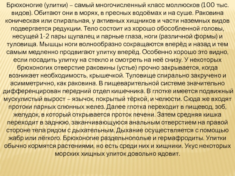 они в морях, в пресных водоёмах и на суше. Раковина коническая или спиральная, у активных хищников и части наземных видов подвергается редукции. Тело состоит из хорошо обособленной головы, несущей 1-2 пары щупалец и парные глаза, ноги (различной формы) и туловища. Мышцы ноги волнообразно сокращаются вперёд и назад и тем самым медленно продвигают улитку вперёд. Особенно хорошо это видно, если посадить улитку на стекло и смотреть на неё снизу. У некоторых брюхоногих отверстие раковины (устье) прочно закрывается, когда возникает необходимость, крышечкой. Туловище спирально закручено и асимметрично, как раковина. В пищеварительной системе значительно дифференцирован передний отдел кишечника. В глотке имеется подвижный мускулистый вырост – язычок, покрытый тёркой, и челюсти. Сюда же входят протоки парных слюнных желез. Далее глотка переходит в пищевод, зоб, желудок, в который открывается проток печени. Затем средняя кишка переходит в заднюю, заканчивающуюся анальным отверстием на правой стороне тела рядом с дыхательным. Дыхание осуществляется с помощью жабр или лёгкого. Брюхоногие раздельнополые и гермафродиты. Улитки обычно кормятся растениями, но есть среди них и хищники. Укус некоторых морских хищных улиток довольно ядовит.