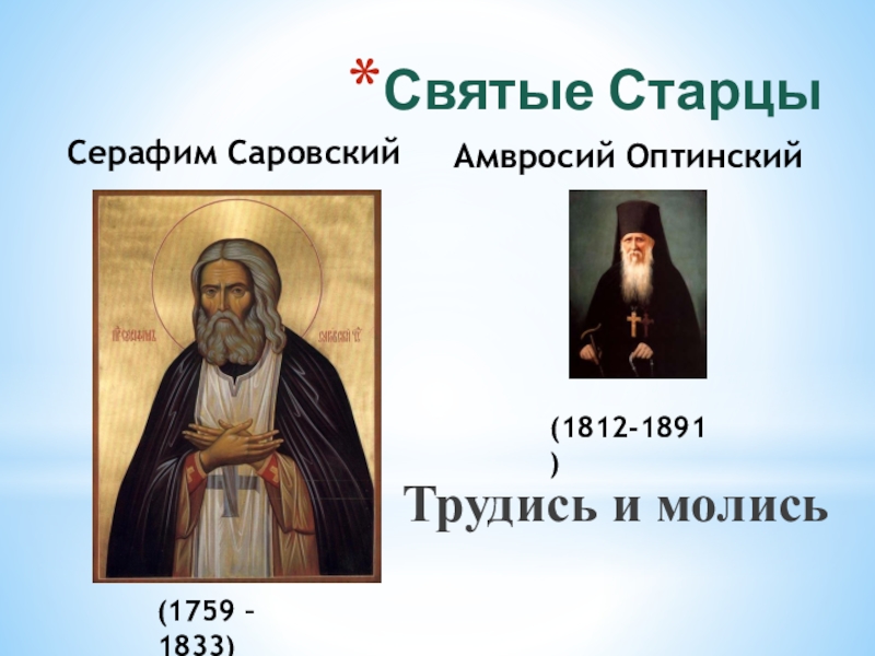 Святые Старцы Трудись и молись(1759 – 1833)Серафим СаровскийАмвросий Оптинский(1812-1891)