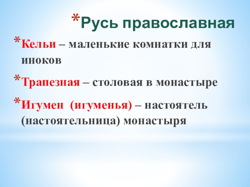 Русь православнаяКельи – маленькие комнатки для иноковТрапезная – столовая в монастыреИгумен (игуменья) – настоятель (настоятельница) монастыря
