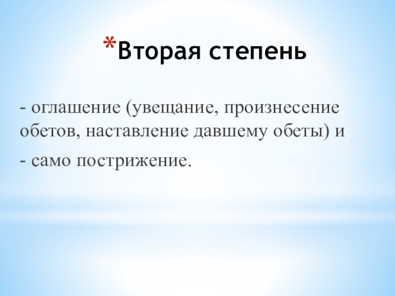 Вторая степень- оглашение (увещание, произнесение обетов, наставление давшему обеты) и- само пострижение.