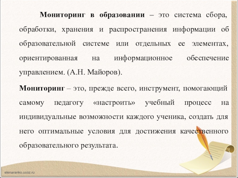 Мониторинг – это, прежде всего, инструмент, помогающий самому педагогу «настроить» учебный процесс на индивидуальные возможности каждого ученика, создать для него оптимальные условия для достижения качественного образовательного результата.