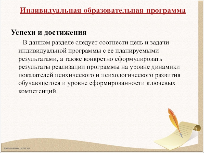 разделе следует соотнести цель и задачи индивидуальной программы с ее планируемыми результатами, а также конкретно сформулировать результаты реализации программы на уровне динамики показателей психического и психологического развития обучающегося и уровне сформированности ключевых компетенций.