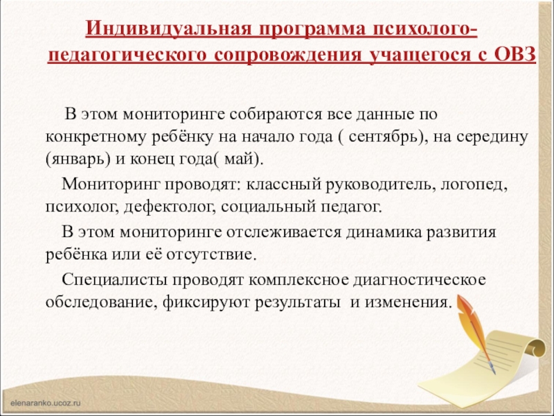 Мониторинг проводят: классный руководитель, логопед, психолог, дефектолог, социальный педагог.